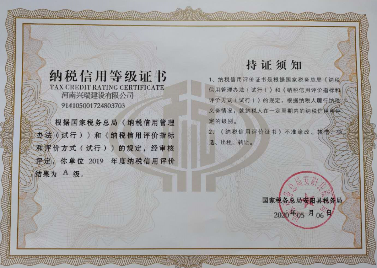 近日,公司被國(guó)家稅務(wù)總局安陽(yáng)縣稅務(wù)局評(píng)定為2019年度納稅信用等級(jí)A 級(jí)企業(yè)。這是公司連續(xù)兩年獲納稅信用等級(jí)“A 級(jí)”評(píng)定,也是對(duì)公司近年來(lái)在依法納稅方面各項(xiàng)工作的充分肯定。
