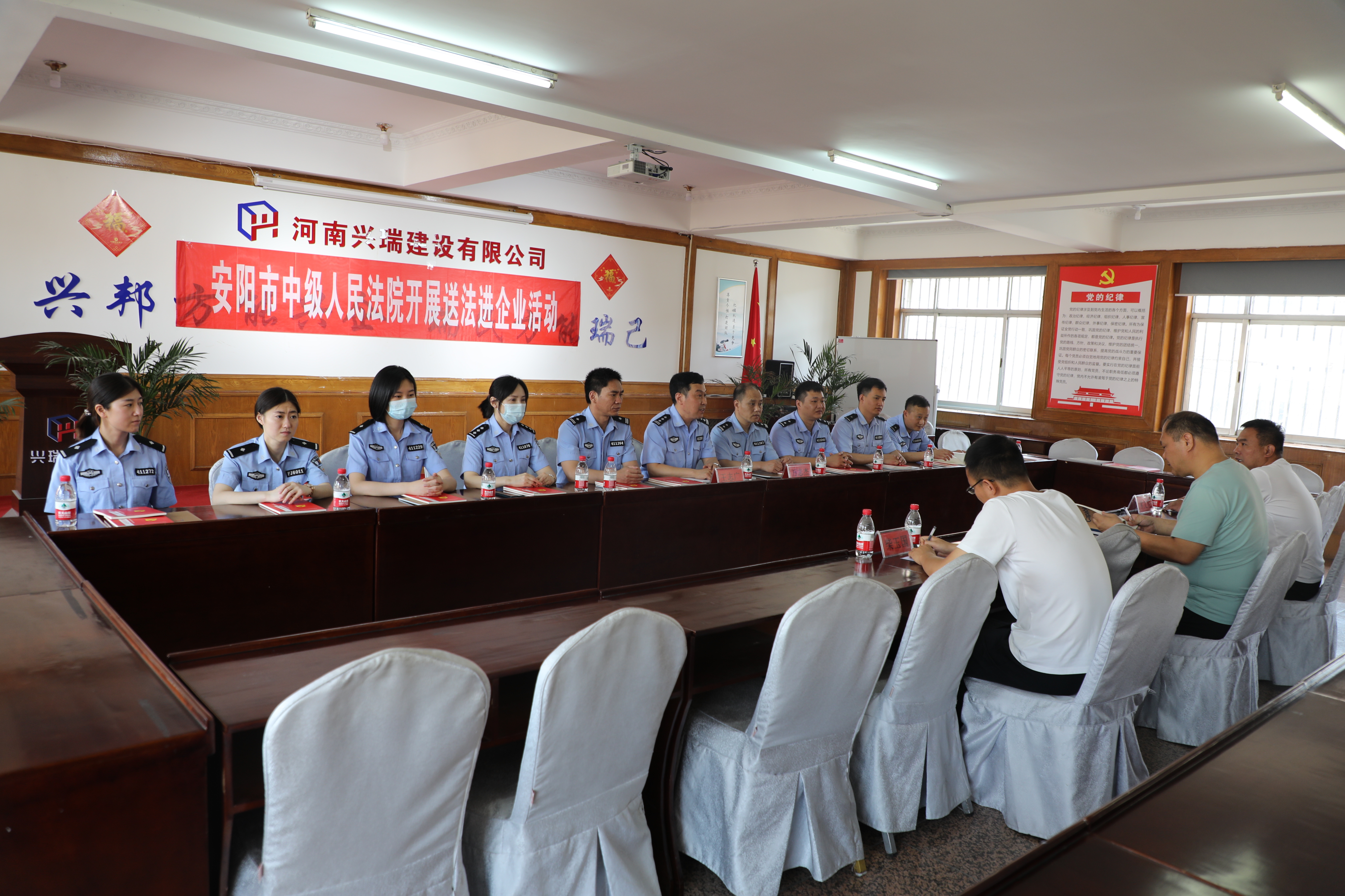 6月23日,安陽市中級(jí)人民法院法警支隊(duì)長王志廣、副支隊(duì)長萬志杰一行來到河南興瑞公司開展送法進(jìn)企業(yè)活動(dòng)。