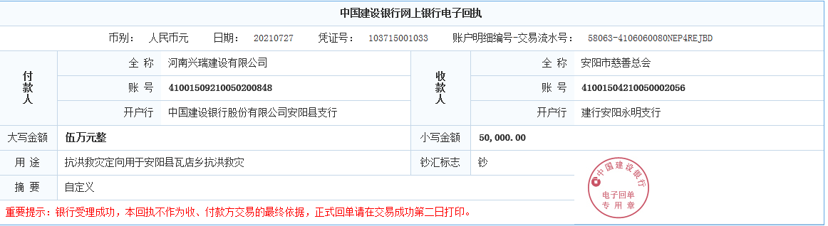 7月27日,公司以轉(zhuǎn)賬的方式向安陽(yáng)市慈善總會(huì)捐贈(zèng)5萬(wàn)元,支援安陽(yáng)縣抗洪救災(zāi)和災(zāi)后重建。