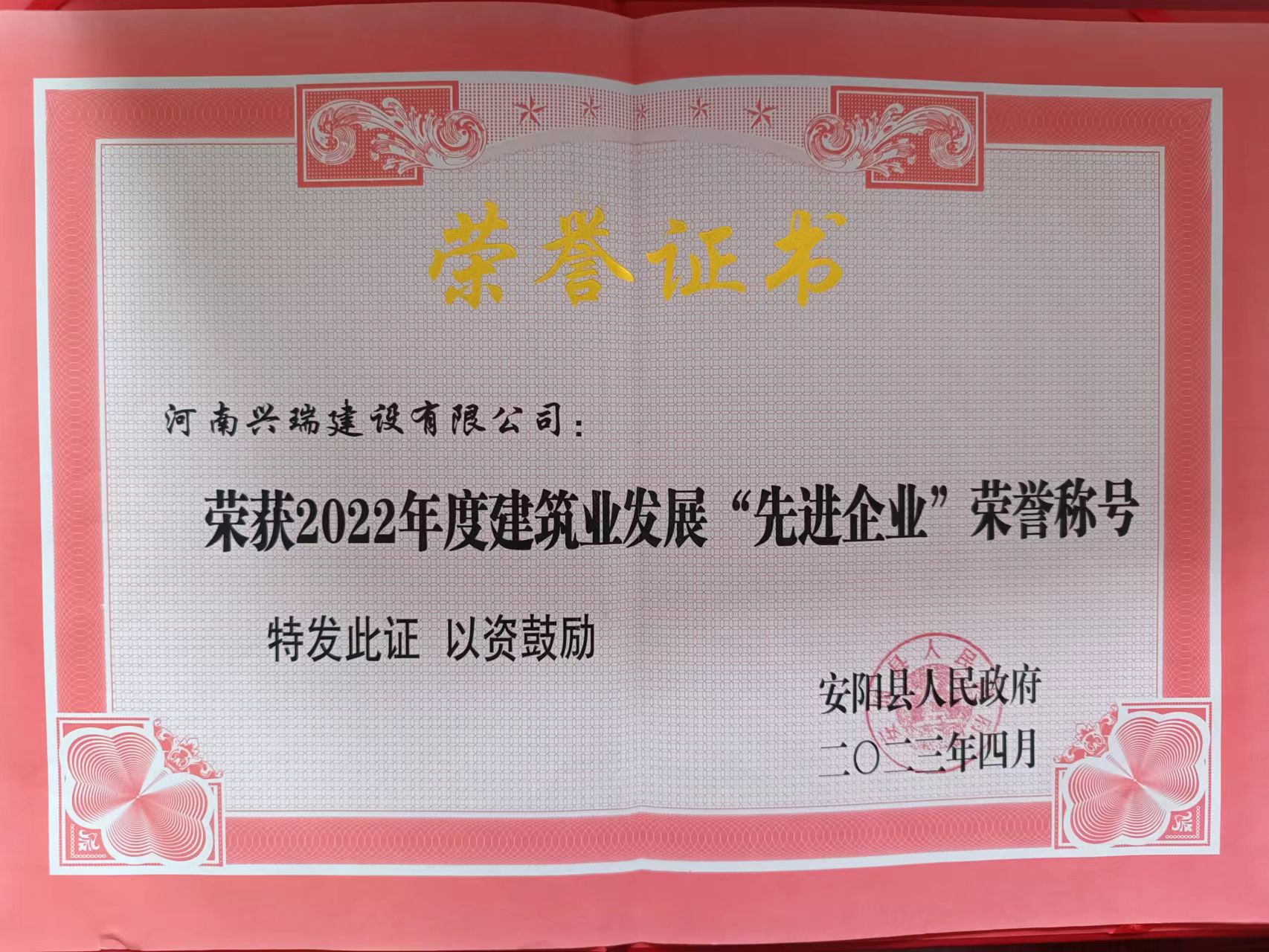2023年4月12日,在安陽縣政府組織召開的2022年度建筑業(yè)發(fā)展大會(huì)上,安陽縣人民政府對(duì)2022年度建筑業(yè)發(fā)展做出突出貢獻(xiàn)的企業(yè)和優(yōu) 秀項(xiàng)目經(jīng)理進(jìn)行了通報(bào)表彰,河南興瑞公司榮獲安陽縣”2022年建筑業(yè)先進(jìn)企業(yè)“,李振榮獲安陽縣”優(yōu) 秀項(xiàng)目經(jīng)理。