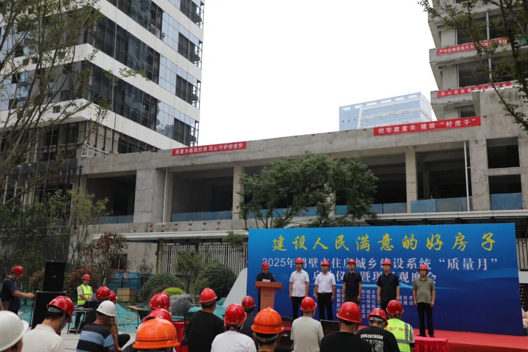 9月16日,2025年鶴壁市住房城鄉(xiāng)建設系統(tǒng)“質量月”啟動儀式暨現(xiàn)場觀摩會在鶴壁市城鄉(xiāng)一體化示范區(qū),河南興瑞公司承建的鶴壁凱旋廣場項目現(xiàn)場舉行。鶴壁市市住房城鄉(xiāng)建設局、示范區(qū)建設管理局相關負責人,各縣區(qū)住建主管部門、質量監(jiān)督機構、在建項目參建單位代表、凱旋廣場甲方代表、監(jiān)理代表、施工單位代表等100余人參加。